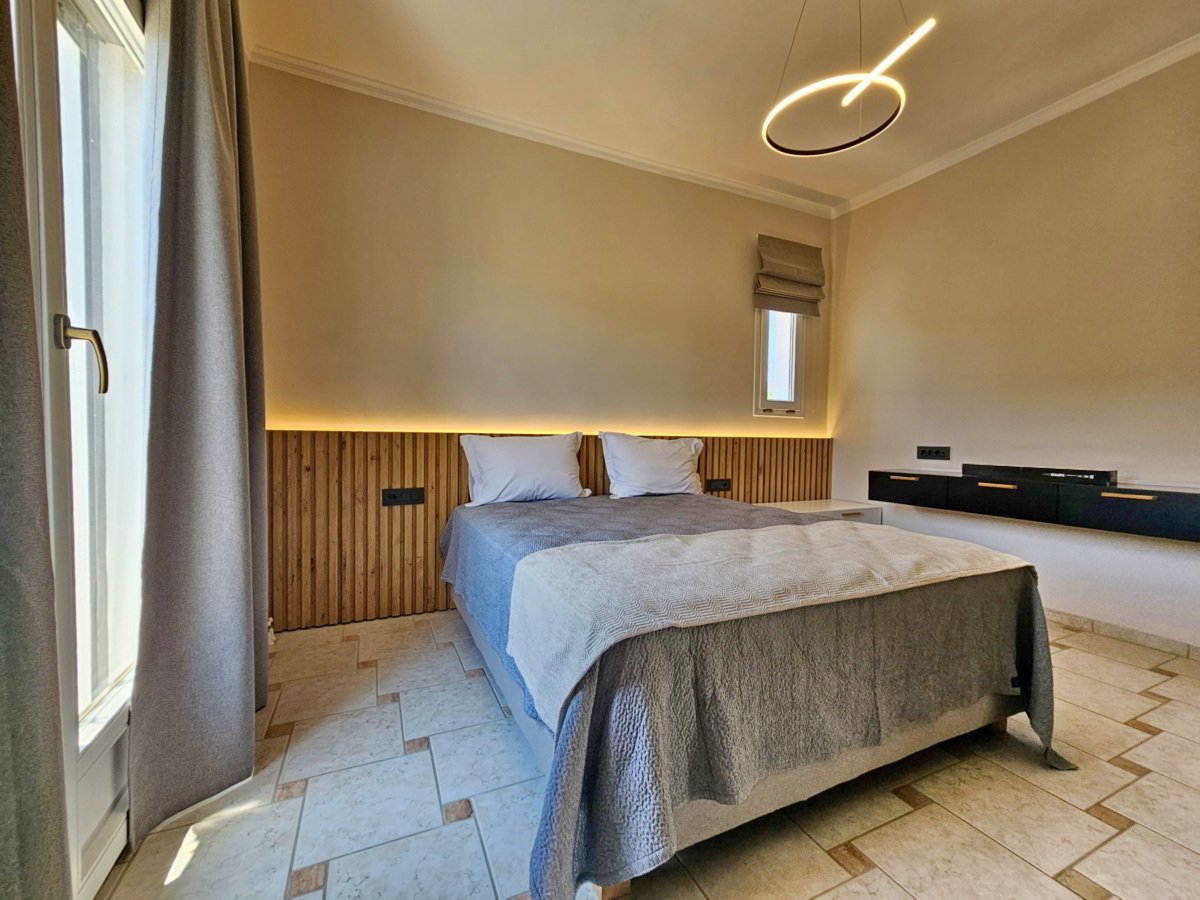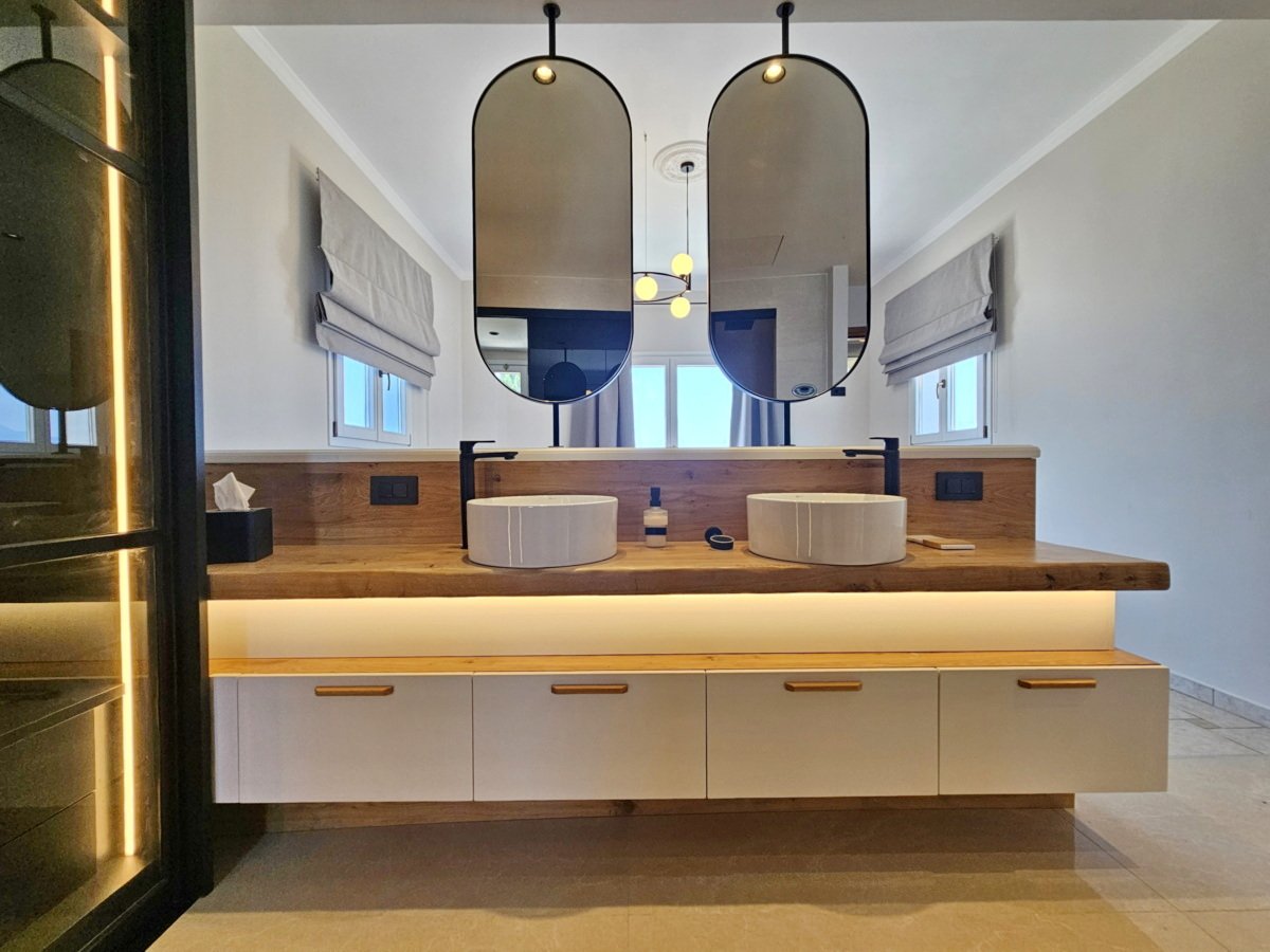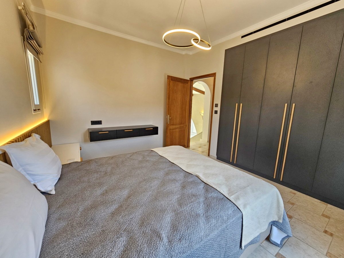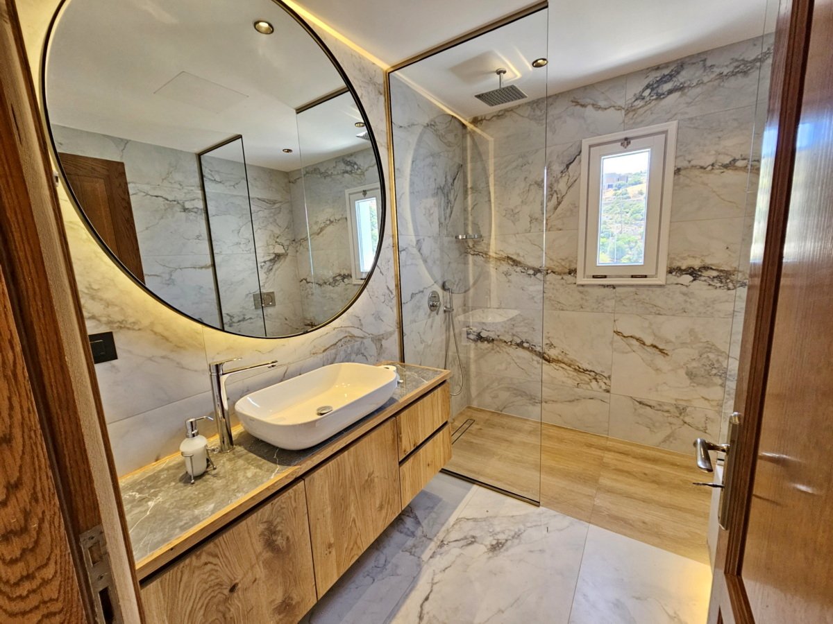 The second floor is dedicated to rest and relaxation. The luxurious master suite features a spa-inspired ensuite bathroom with a traditional Hammam, creating a serene private retreat. Two additional double bedrooms share a spacious bathroom and open onto balconies with sweeping views of the bay and surrounding landscapes.