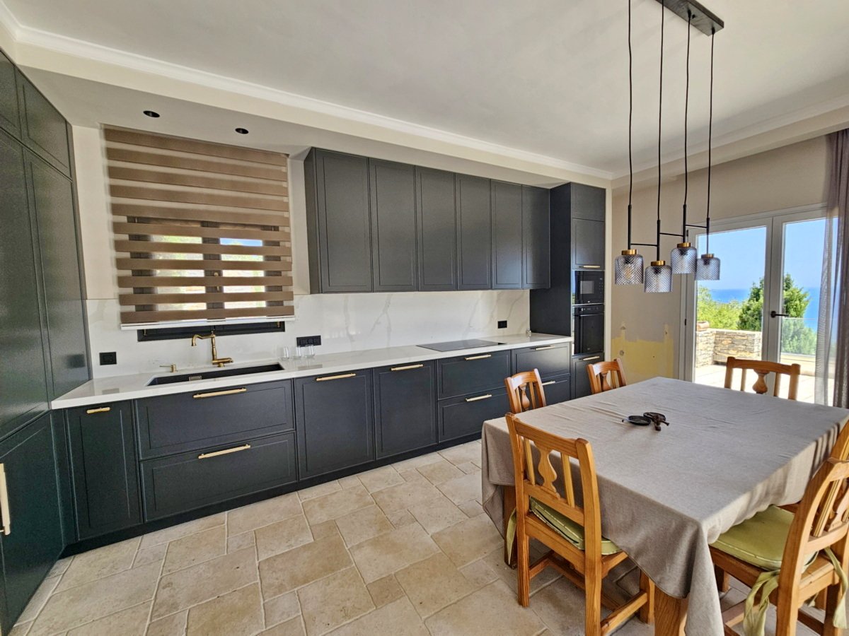 On the first floor, a modern kitchen flows seamlessly into an elegant dining area, ideal for family meals or entertaining. The cozy living room with fireplace adds warmth and charm, while a private study provides a quiet workspace. A semi-open terrace with automated pergola allows year-round enjoyment of the panoramic sea views.