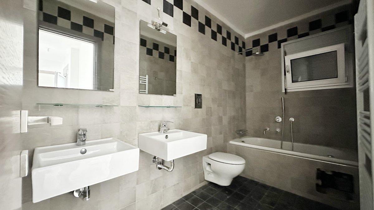 The first floor includes three comfortable bedrooms, each with access to a balcony overlooking the surrounding greenery. Built-in wardrobes provide ample storage, and a spacious bathroom with a bathtub serves the floor.