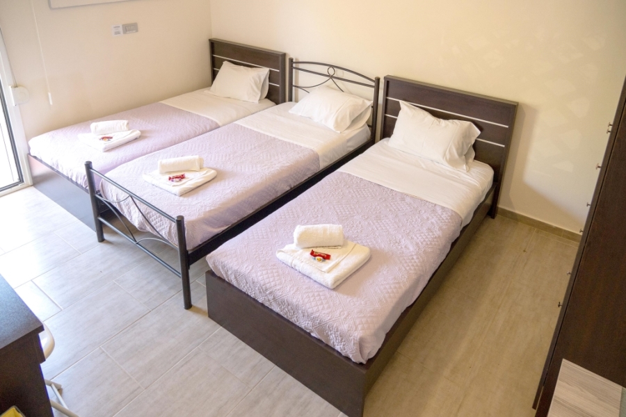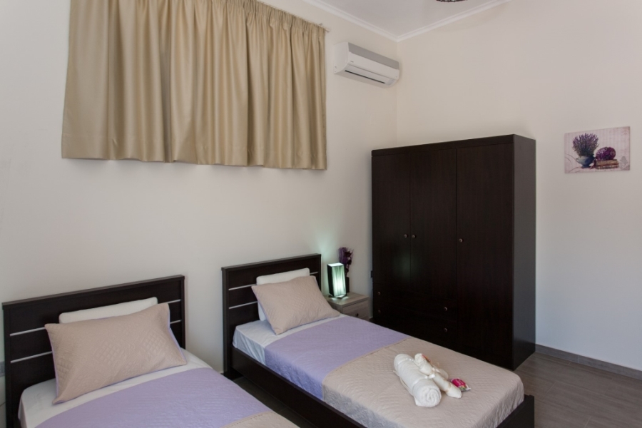 The main building of 124 m² is thoughtfully arranged into two fully independent apartments, making it perfectly suited for rental income, guest accommodation, or multi-generational living. The ground floor apartment, measuring 74 m², features two bedrooms and a welcoming living area that opens directly onto a spacious courtyard and beautifully maintained gardens, creating a seamless indoor-outdoor lifestyle. The first-floor apartment of 50 m² also offers two bedrooms and a bright living space, complemented by four large balconies that provide open views of the surrounding landscape. Accessed via an external granite staircase, it ensures complete privacy from the lower level, while both units benefit from separate entrances.